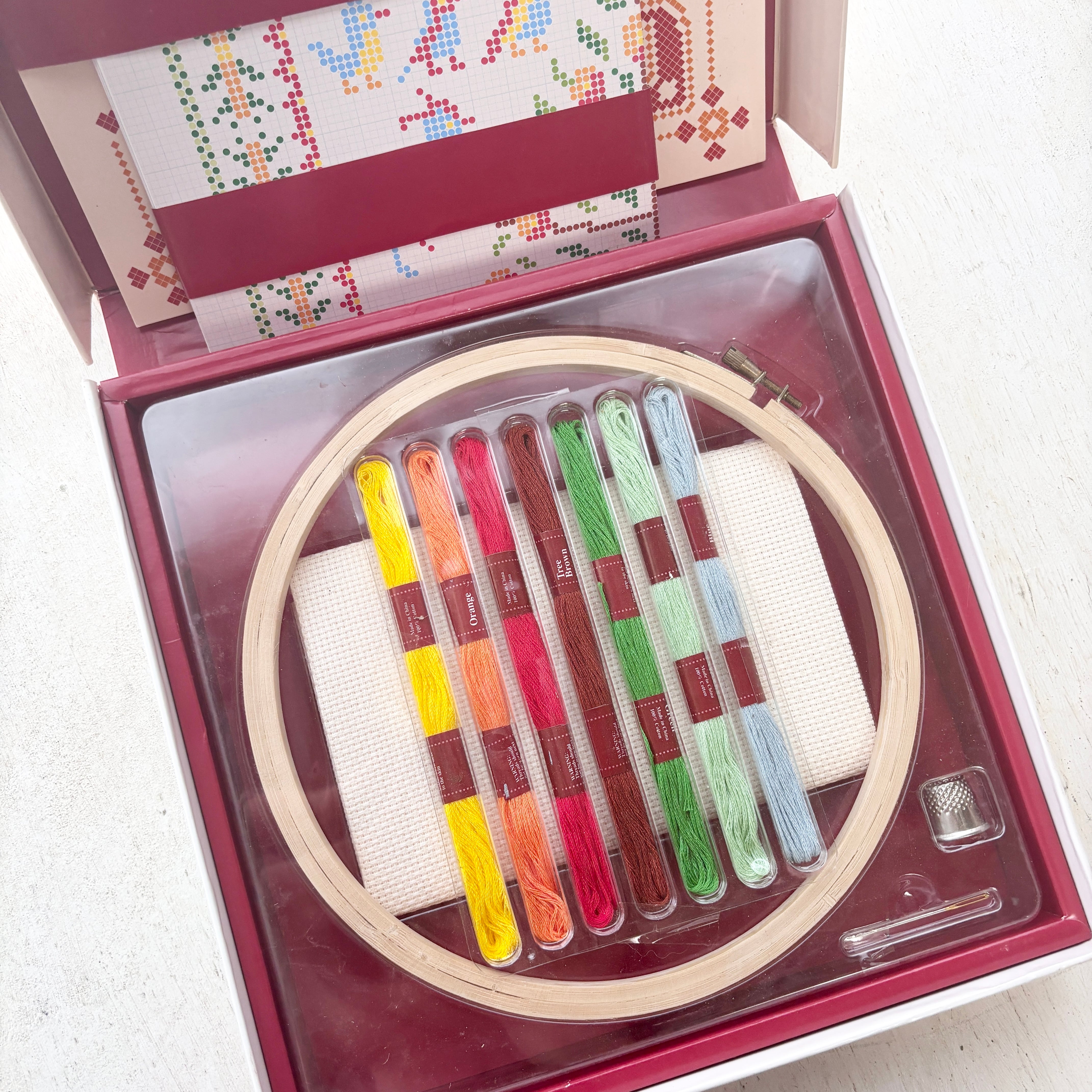 封入された針・刺繍糸・刺繍布・指抜き・刺繍枠ですぐに刺繍が始められる、初心者さんにもおすすめのセットです。