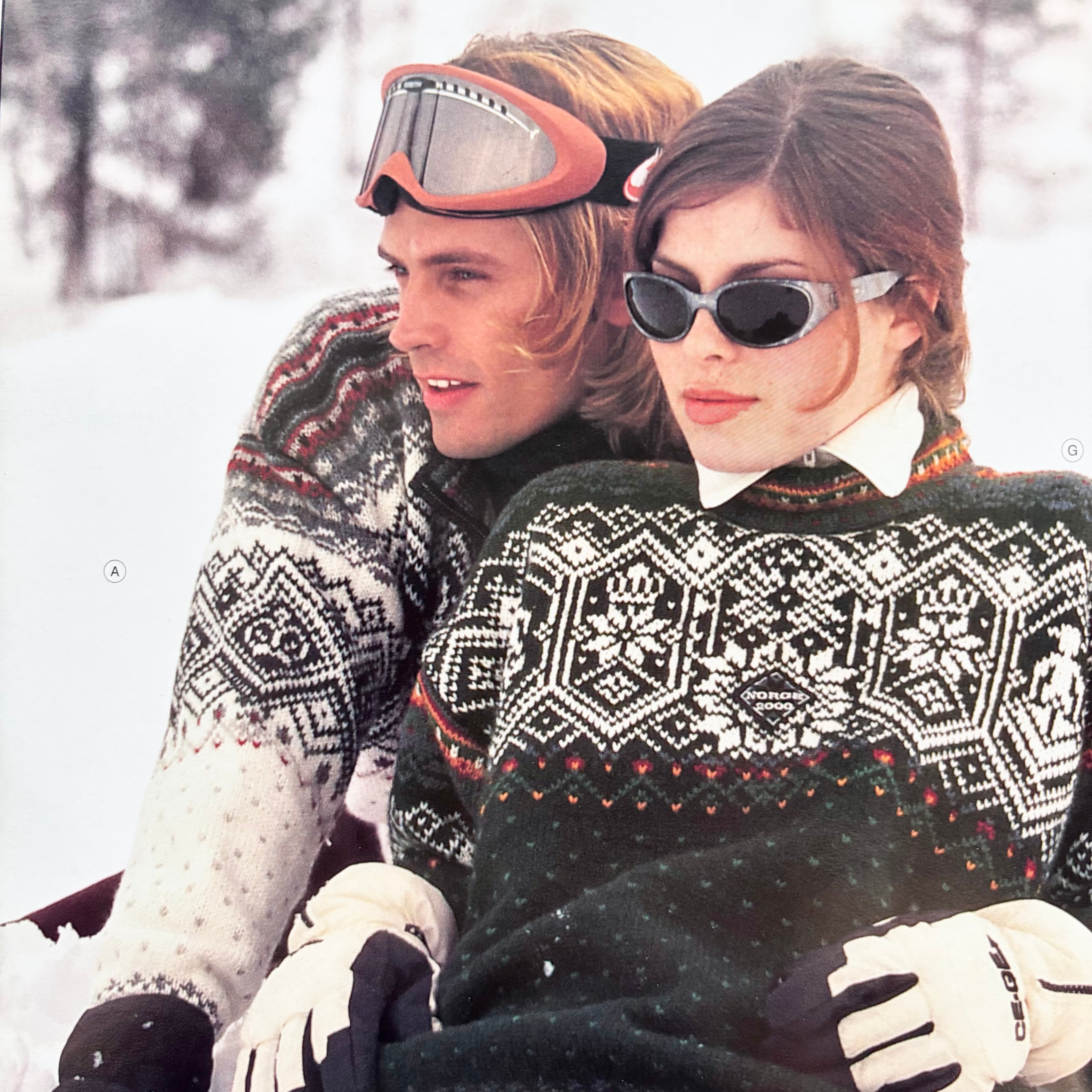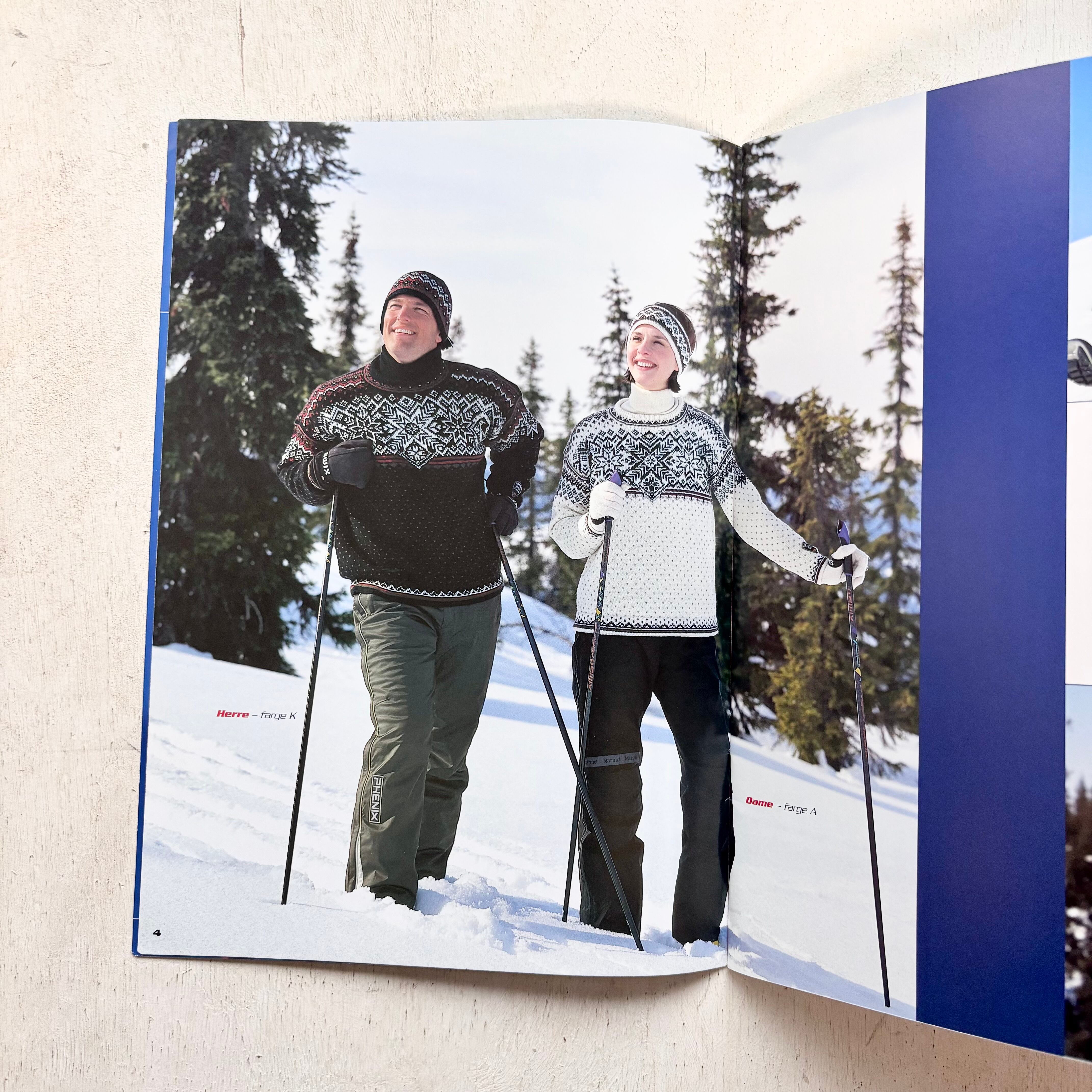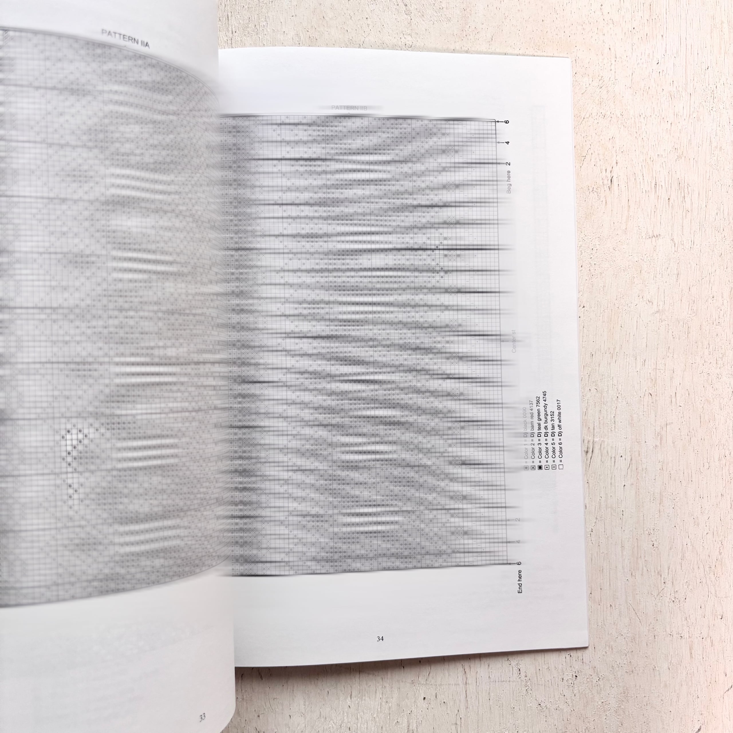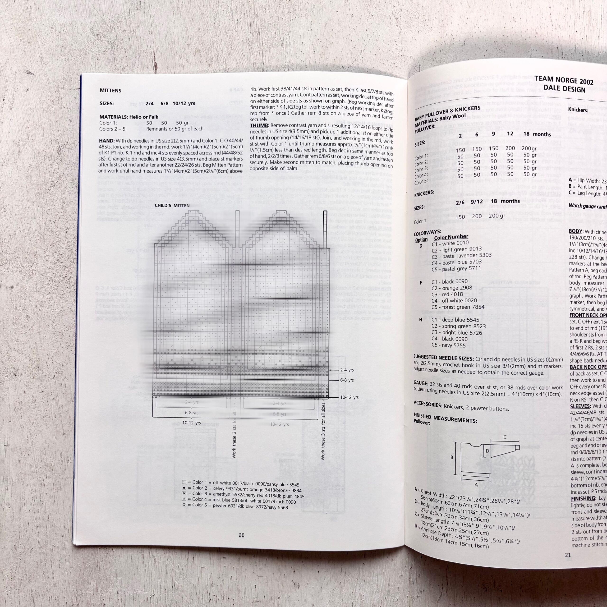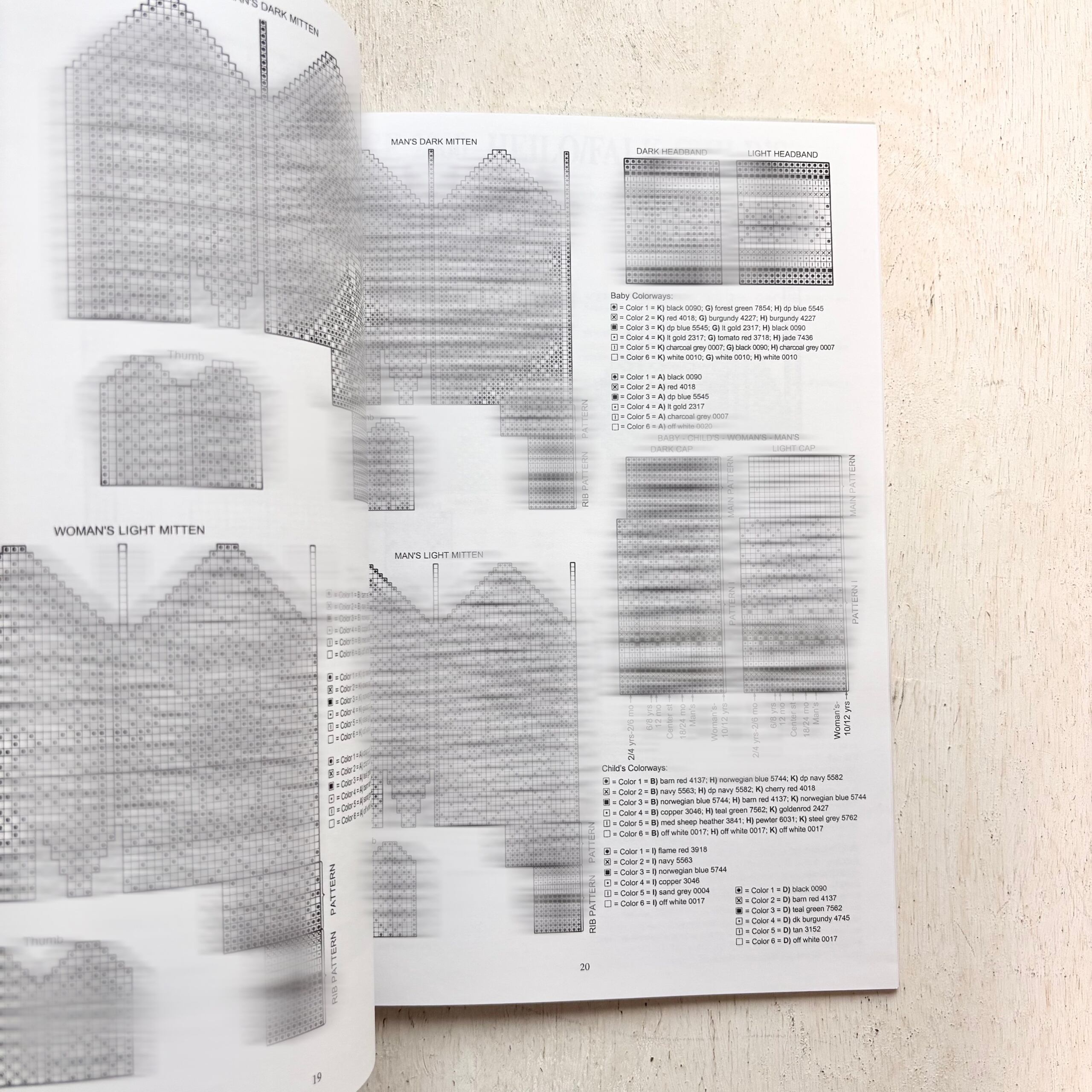 雪の結晶などのモチーフや幾何学模様、ドットなどノルウェーの伝統柄のニットアイテムの図版とパターンを収載。