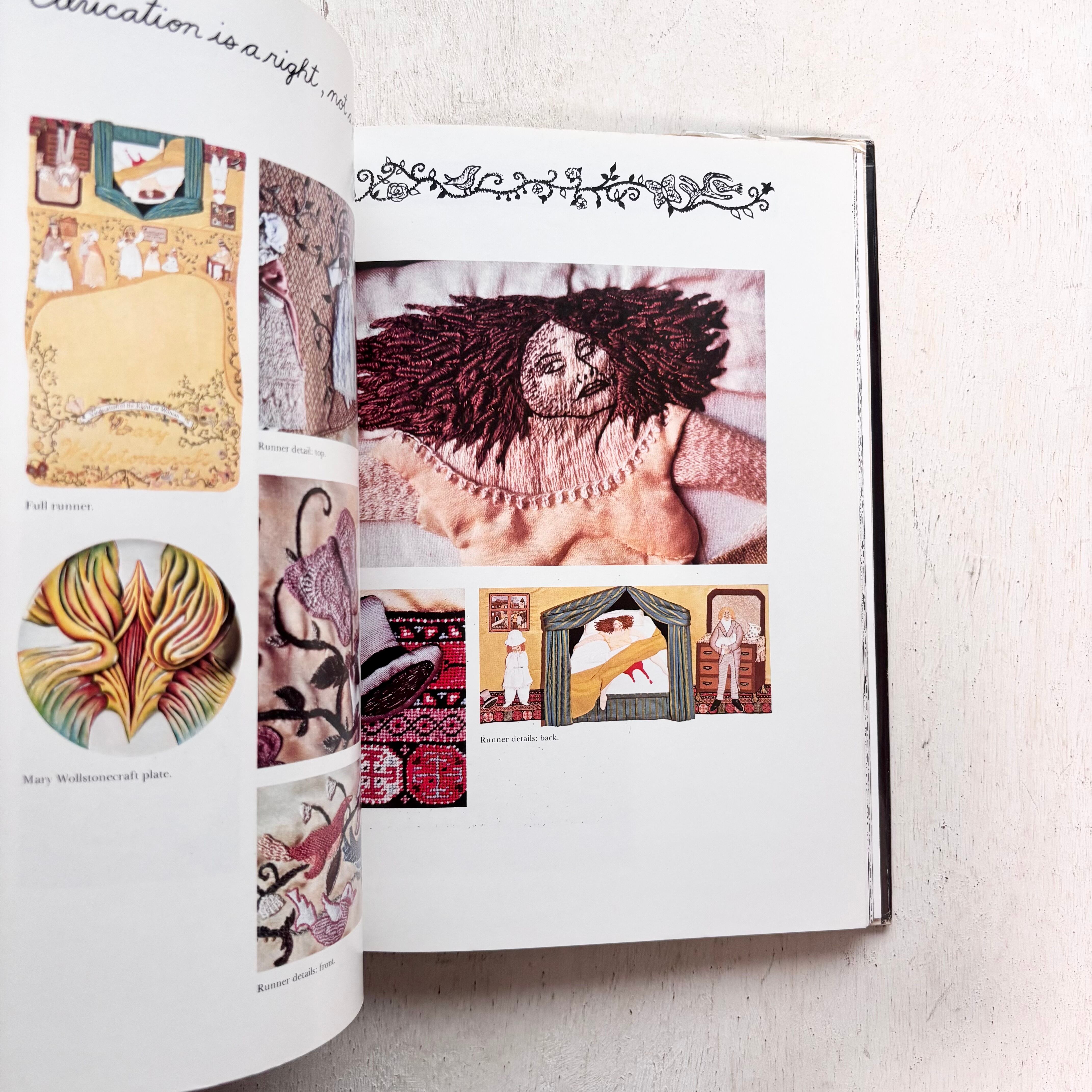 針仕事の背景が図像と共に丁寧に解説され、制作過程や技術的な詳細も紹介されています。
