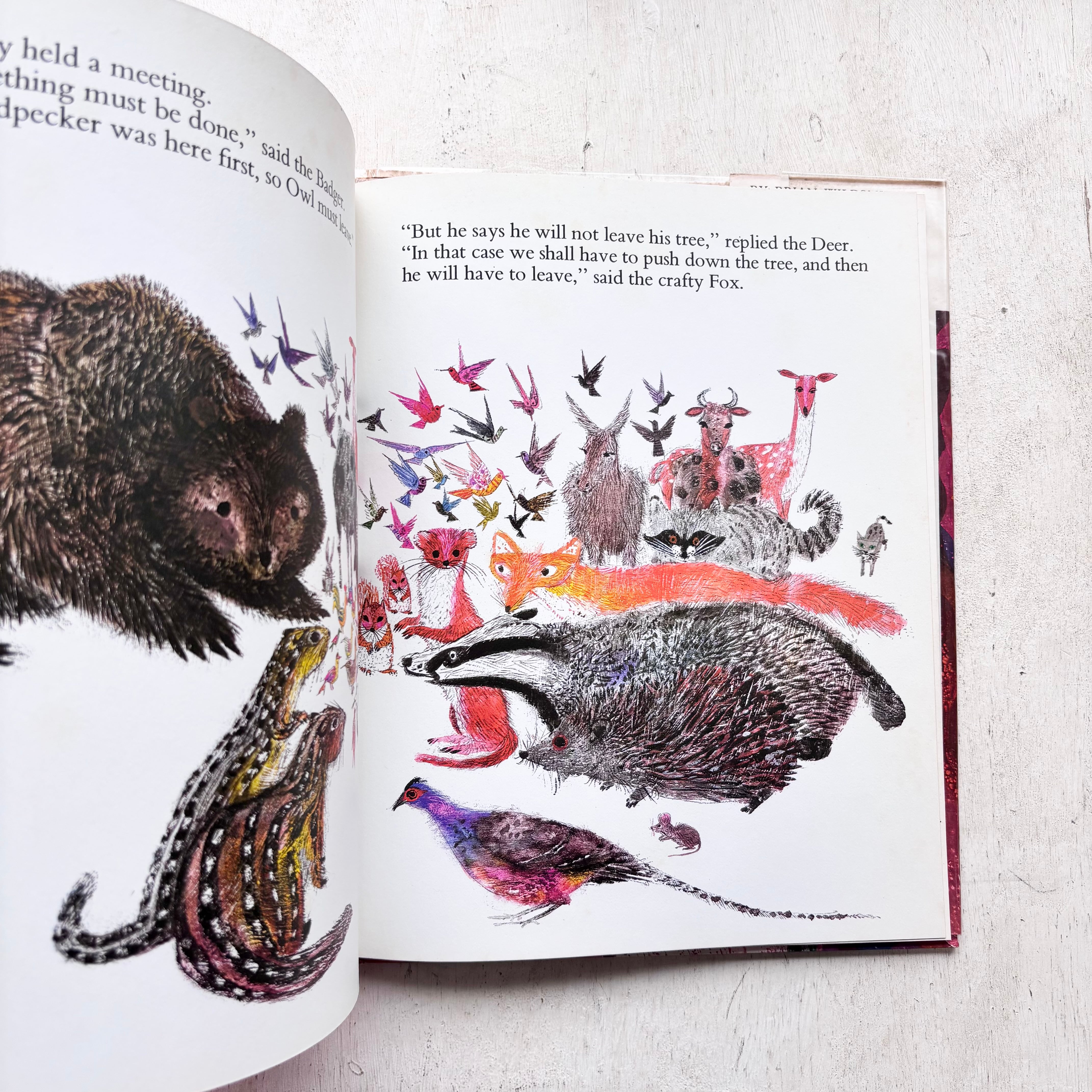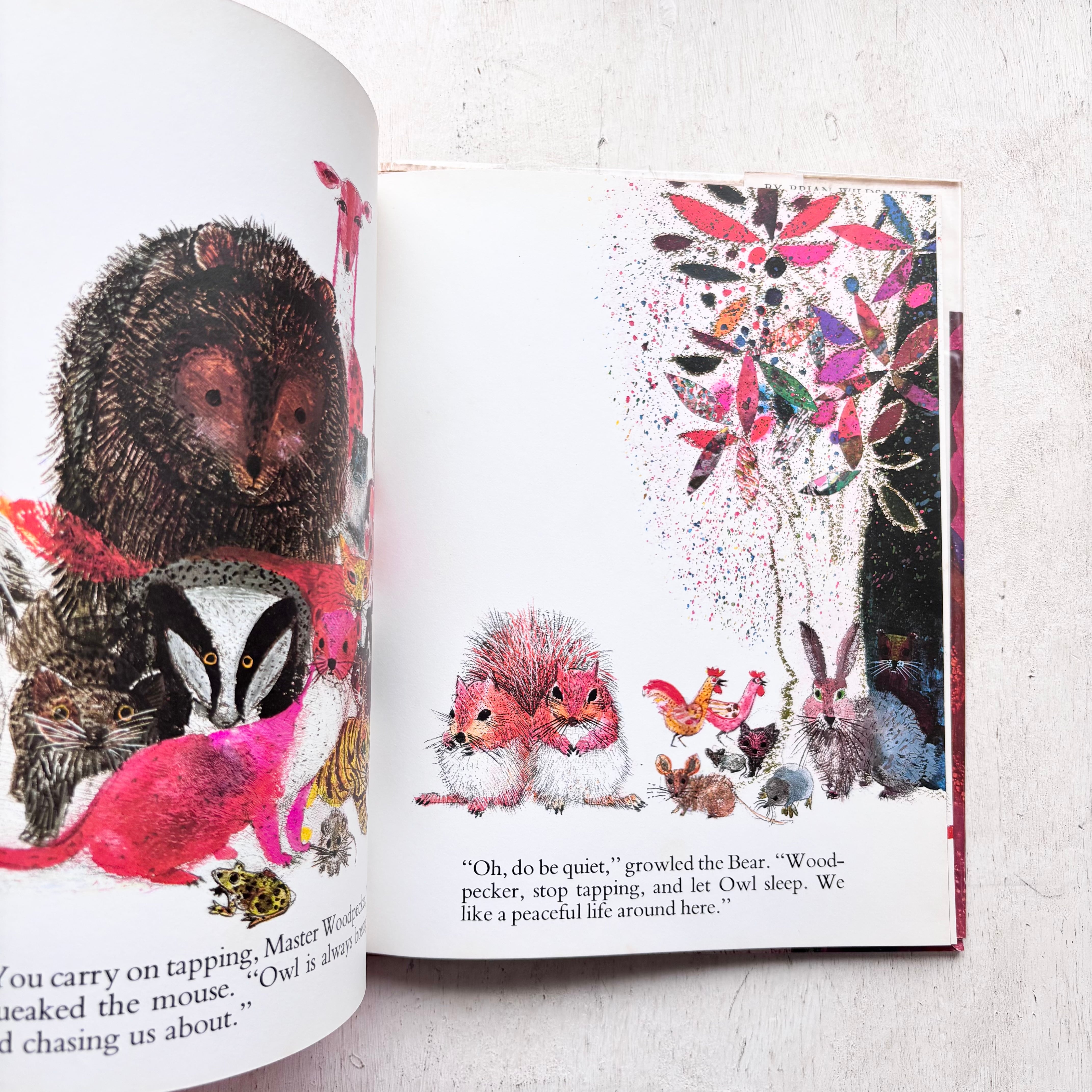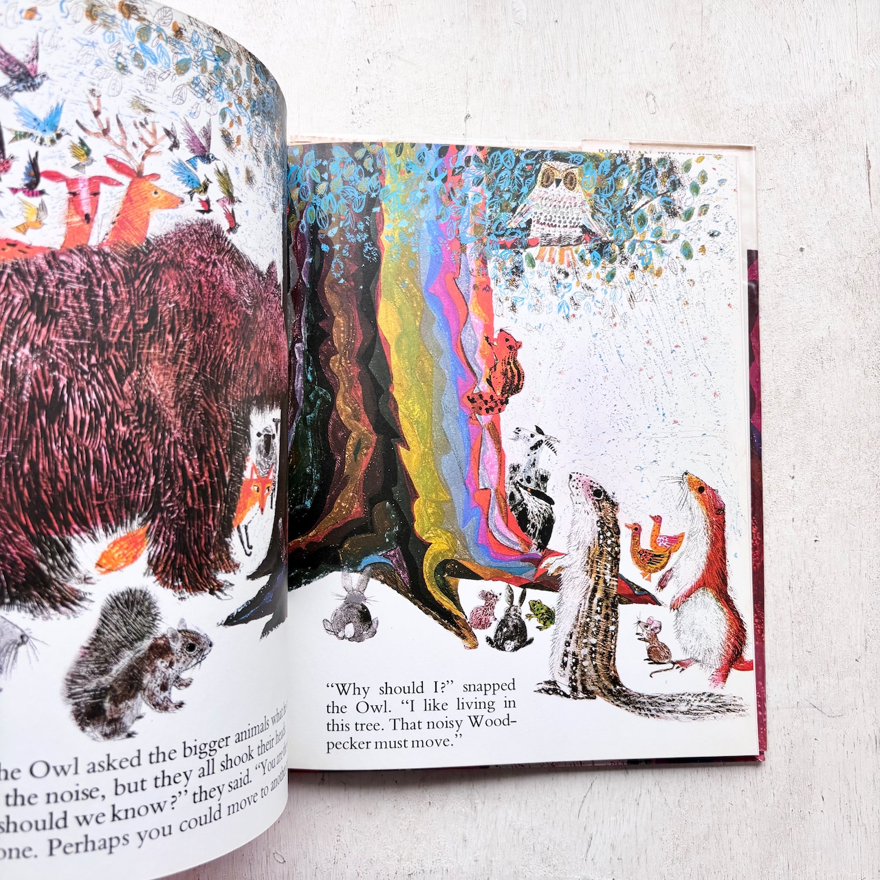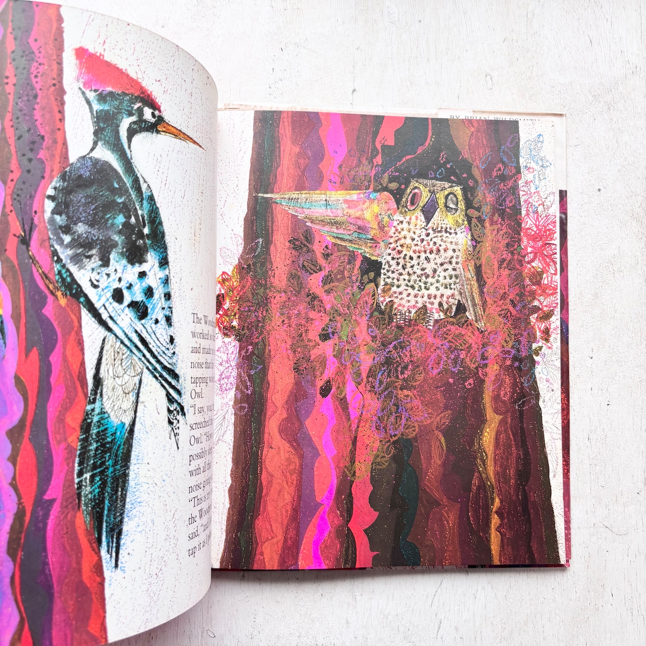 鮮やかな色彩で、ふくろうやキツツキをはじめとした動物の様子を生き生きと描いた美しい絵本です。