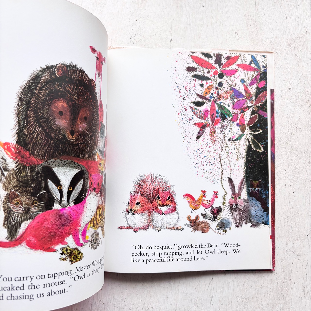 眠ろうとするフクロウの木のそばで、木を突くキツツキのお話。