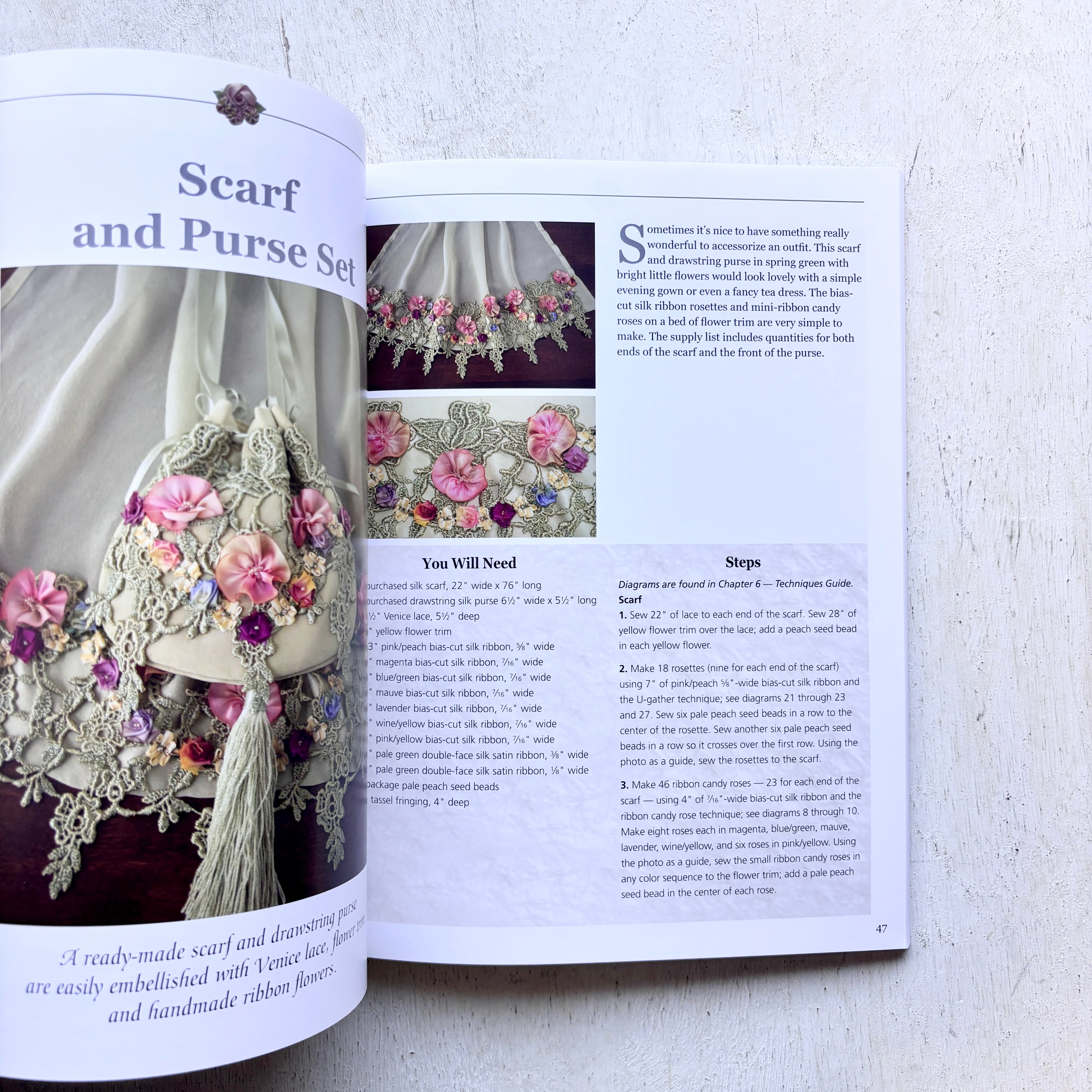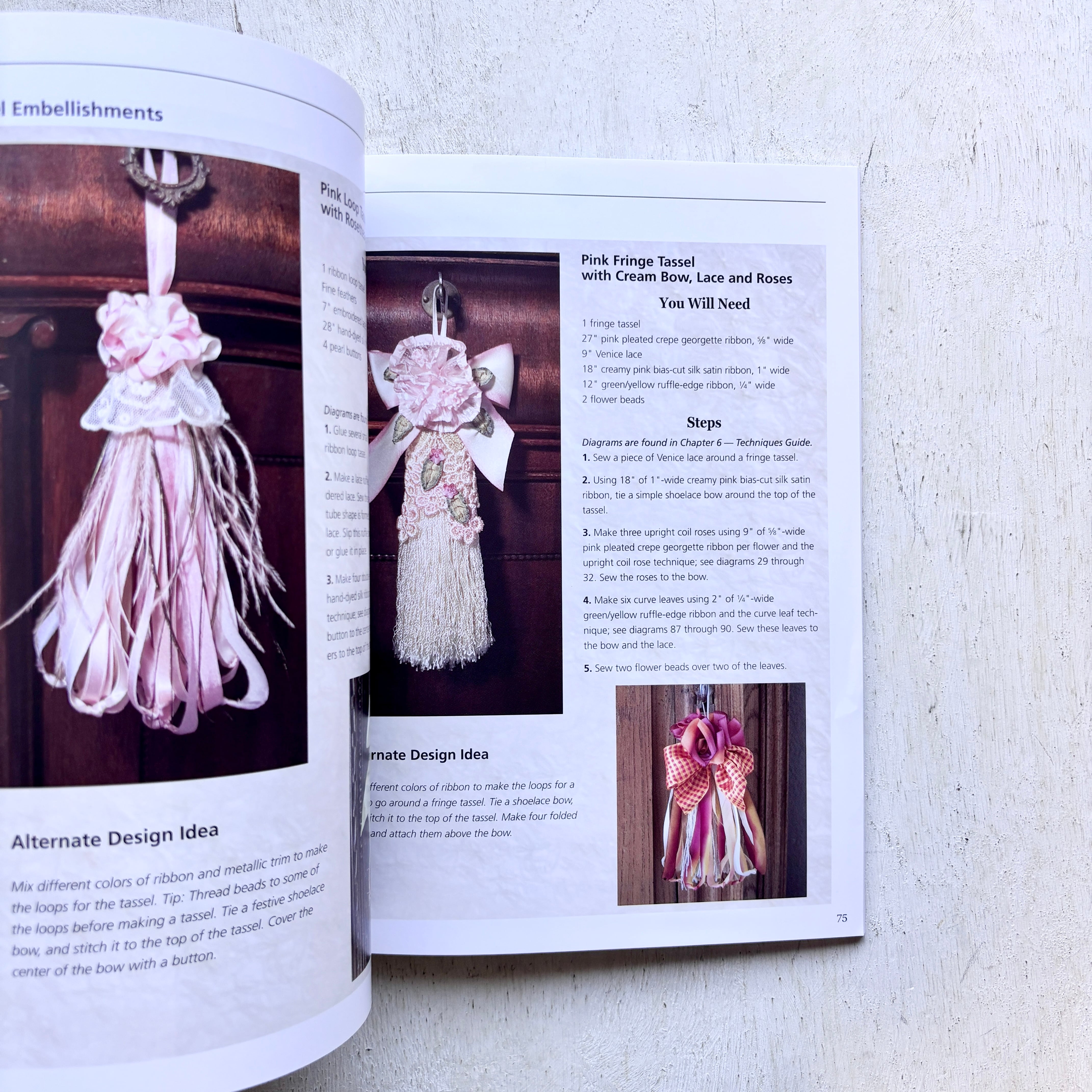 ヴィンテージリボンワークの資料写真も掲載されており、作品づくりのインスピレーションにも。リボンで作り出す優美な世界をお楽しみください。