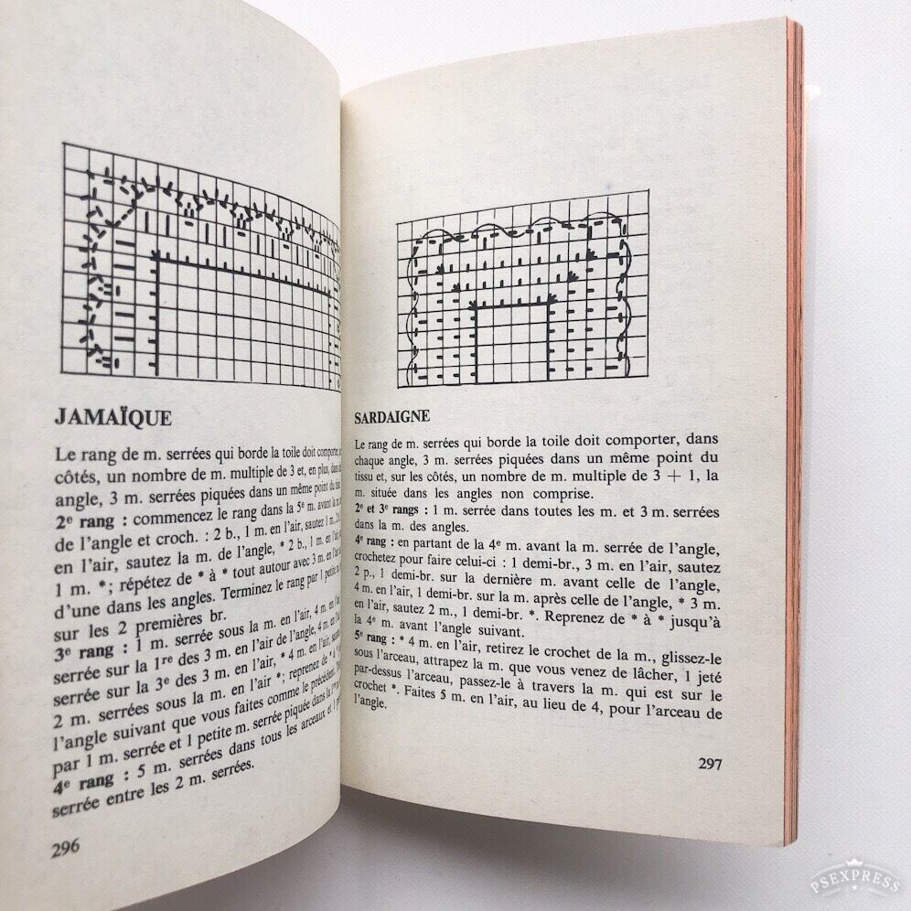 かぎ針編みの様々な編み方を編み図、写真、テキストで説明されたフランスの編み物ガイド。メインは編み方ガイドですが、洋服、ハンカチの縁編み、テーブルウェアへの仕立方も数ページ掲載されています。オールモノクロ。