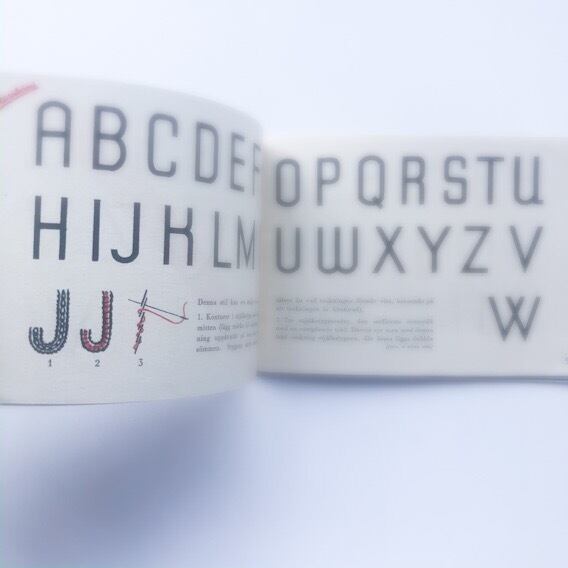 スウェーデンのヴィンテージアルファベット刺繍図案集。リネン生地に適した小さなアルファベットデザイン。10種以上のフォントデザインを収載。図案の左下には刺し方のバリエーションのイラストがあります。赤と黒の2色印刷。