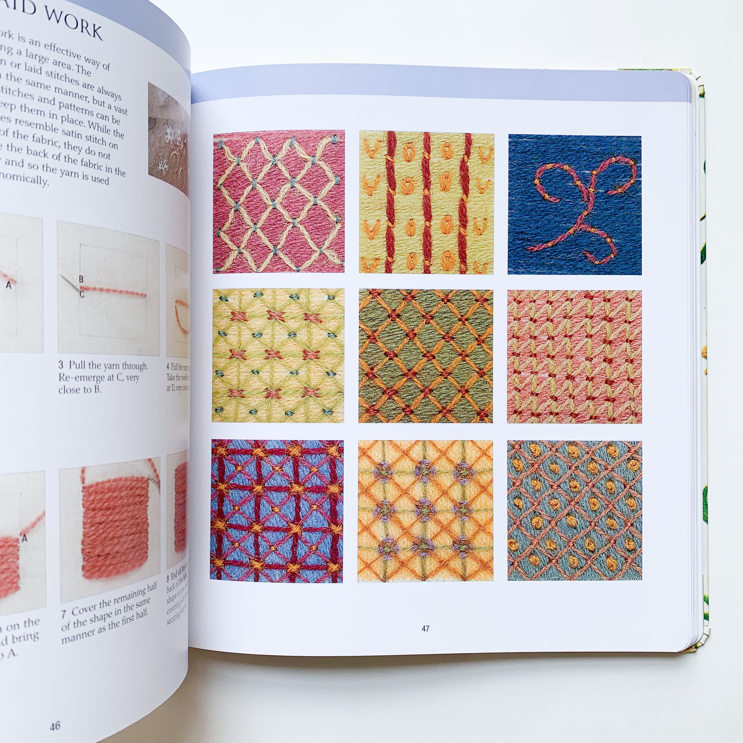 多数の刺繍テクニックと応用作品を紹介したクルーエル刺繍の本です。前半ページでは53種類のステッチを手順に沿って写真とテキストで刺し方を解説、後半ではステッチを応用したクルーエル刺繍の草花のモチーフと図案が紹介されています。デザインは深みのあるくすんだ色合いが多く使用されているのが特徴的です。テキストには羊毛、布地の選択から必要な道具まで、さまざまなポイントが含まれています。オールカラー(巻末の図案のみモノクロ)
