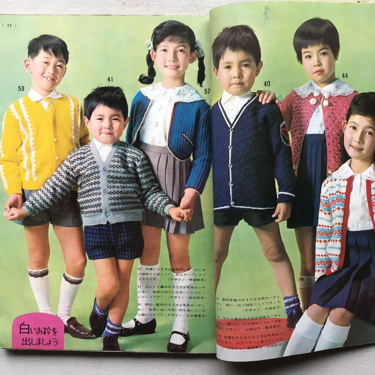 子供用のセーター、カーディガン、ベストなどの編み物図案が計60点以上。余所行き、発表会、普段着、エプロンなどのパターンも計50点以上掲載されています。