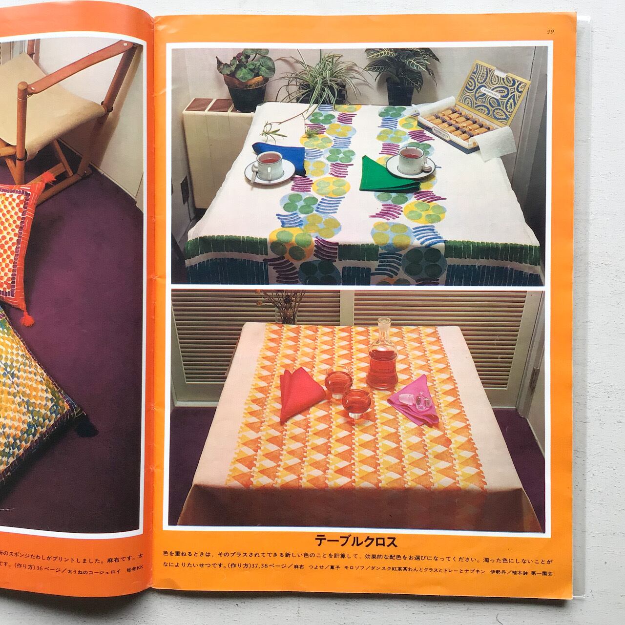 掲載作品は、クロスヘリンボーン・ステッチ、クロスステッチ、チェーン・ステッチのランチョンマット、版染めで作るランチョンマット、テーブルクロス、クッションカバー。棒針編みで作るベスト。カラーモザイクのクッション、ベッドカバー。マットの編み方など。その他にもコラムなどが掲載されています。レトロで独特な雰囲気が目を惹きます。モノクロ&カラー。
