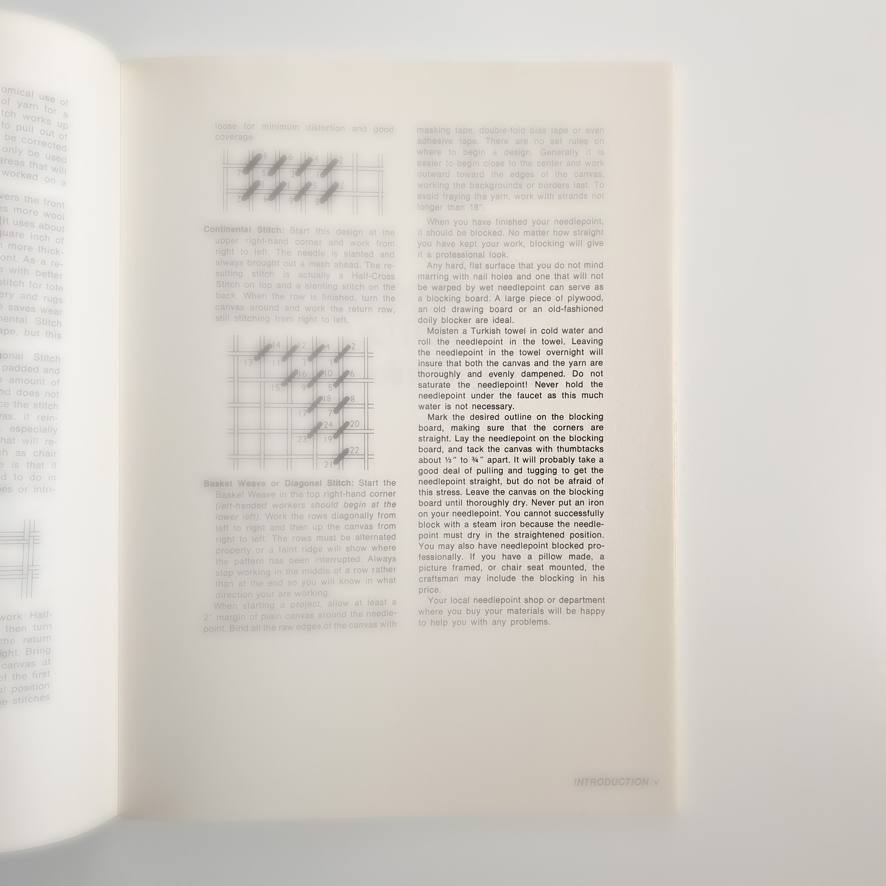 ペンシルベニア・ダッチ・カントリーは、ドイツ語圏からアメリカへ移住し、そこで新しい生活を始めた人々が住み始めた場所で魅力的な町の一つです。そこで著書が日常の中にある物からインスピレーションを受け、ニードルポイントのパターンにしています。作品はどれも素朴で、色も伝統的なペンシルベニア色にはなっていますが、このデザインを元にオリジナル作品に挑戦してはいかがでしょうか、と著者も本文で説明しています。完成作品はカラーで、刺し方やパターンはモノクロになります。