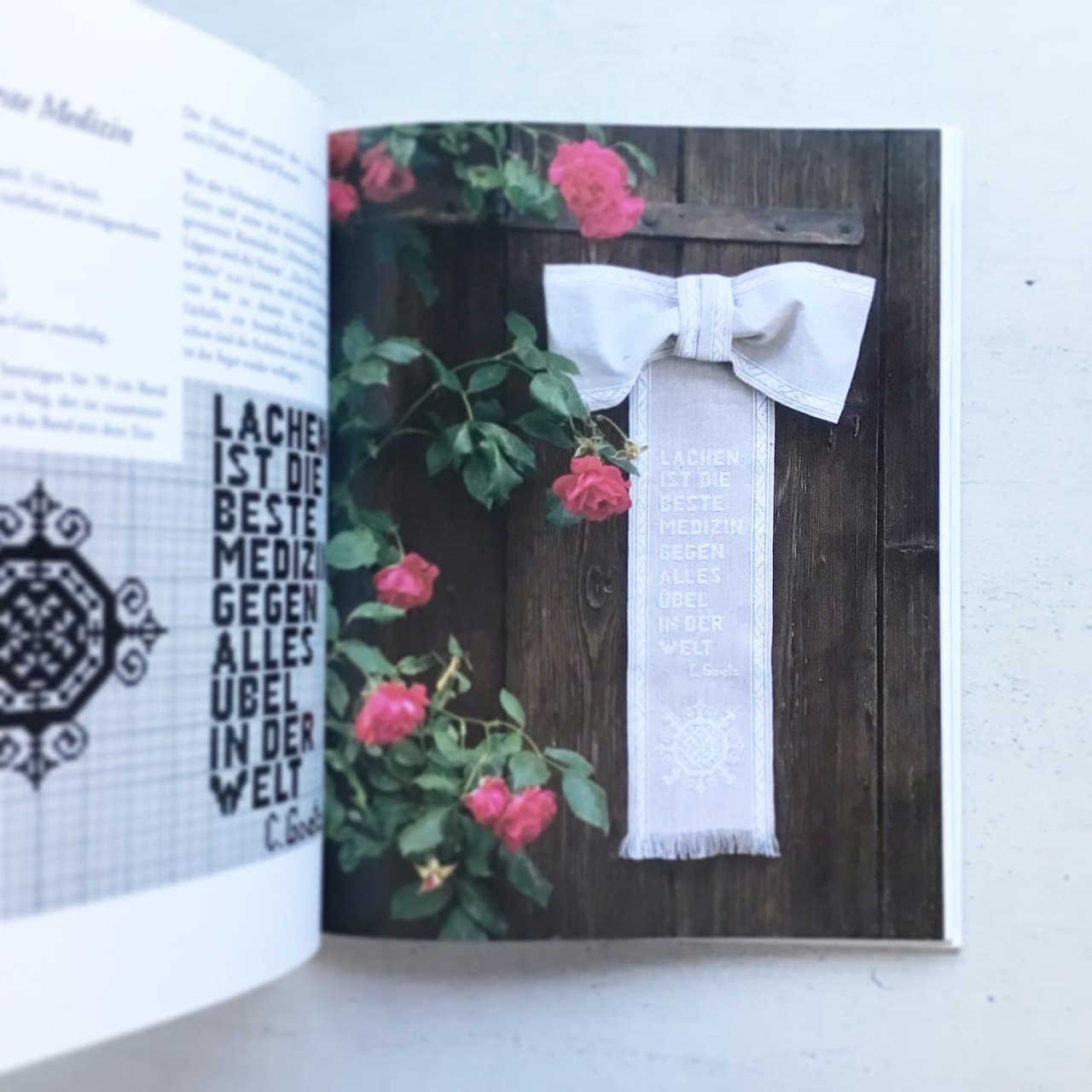 リボンにクロスステッチを施すデザインに特化した内容の1冊です。例えば帽子に、玄関の飾りに、キャンドルスタンドに、と色々な場面でのリボン装飾にひと手間をかけてより素敵な空間が広がるのが垣間見えます。本文はドイツ語となりますが、完成作品も図案も全てカラーですので、よりわかりやすいかと思います。
