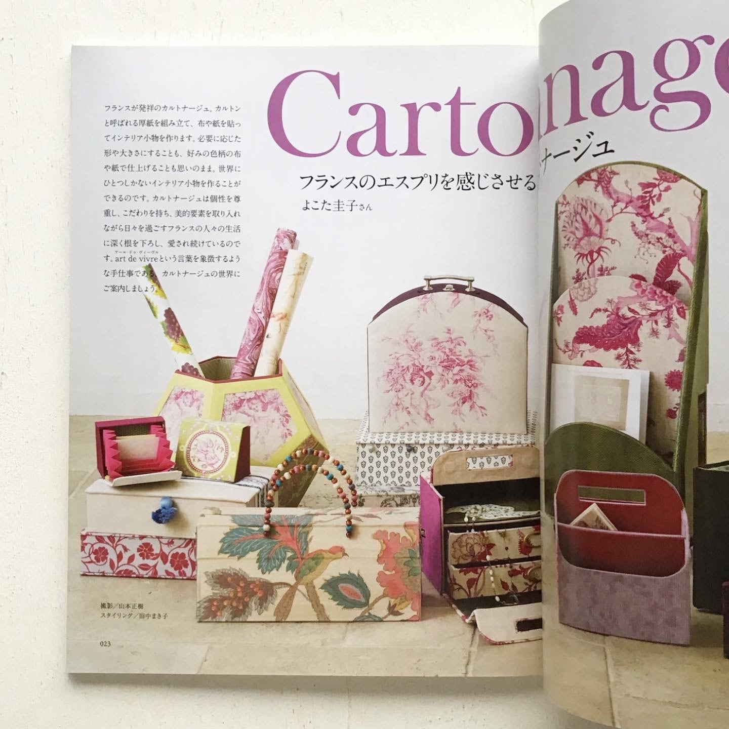 特集はフランスの手仕事や暮らしの知恵。リボン刺しゅう、カルトナージュ、フレンチロココから日本のモダンキモノへ、花のある暮らしなど、どの記事も読みごたえがあります。付録に小倉ゆき子さん監修のリボン刺しゅうを楽しむミニポーチキット付き。西須久子さんデザインのビスコーニュ、オノエメグミさんのビオラのブーケ図案、シェットランドレースのスカーフなど、誌面に掲載されている一部作品の図案が付いております。