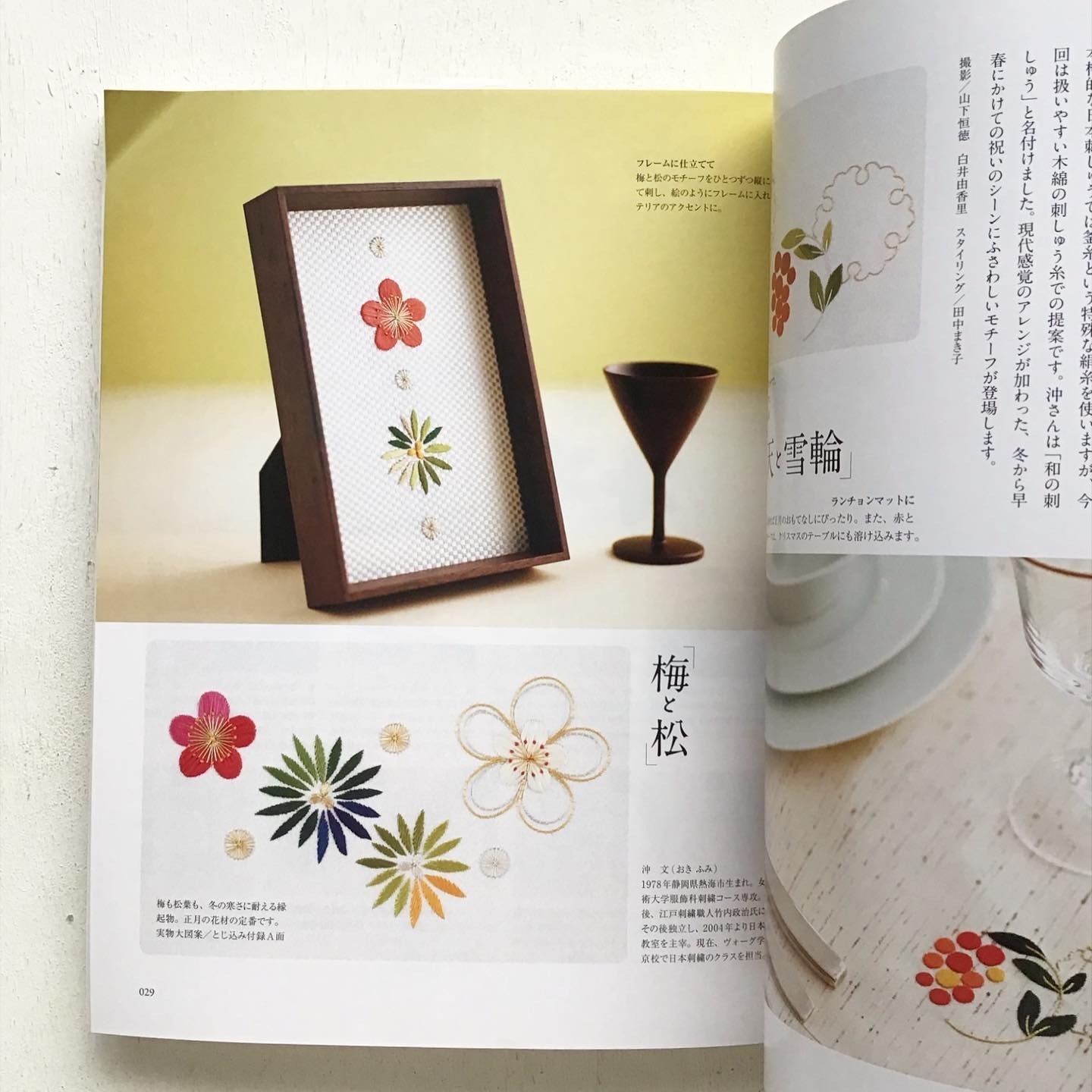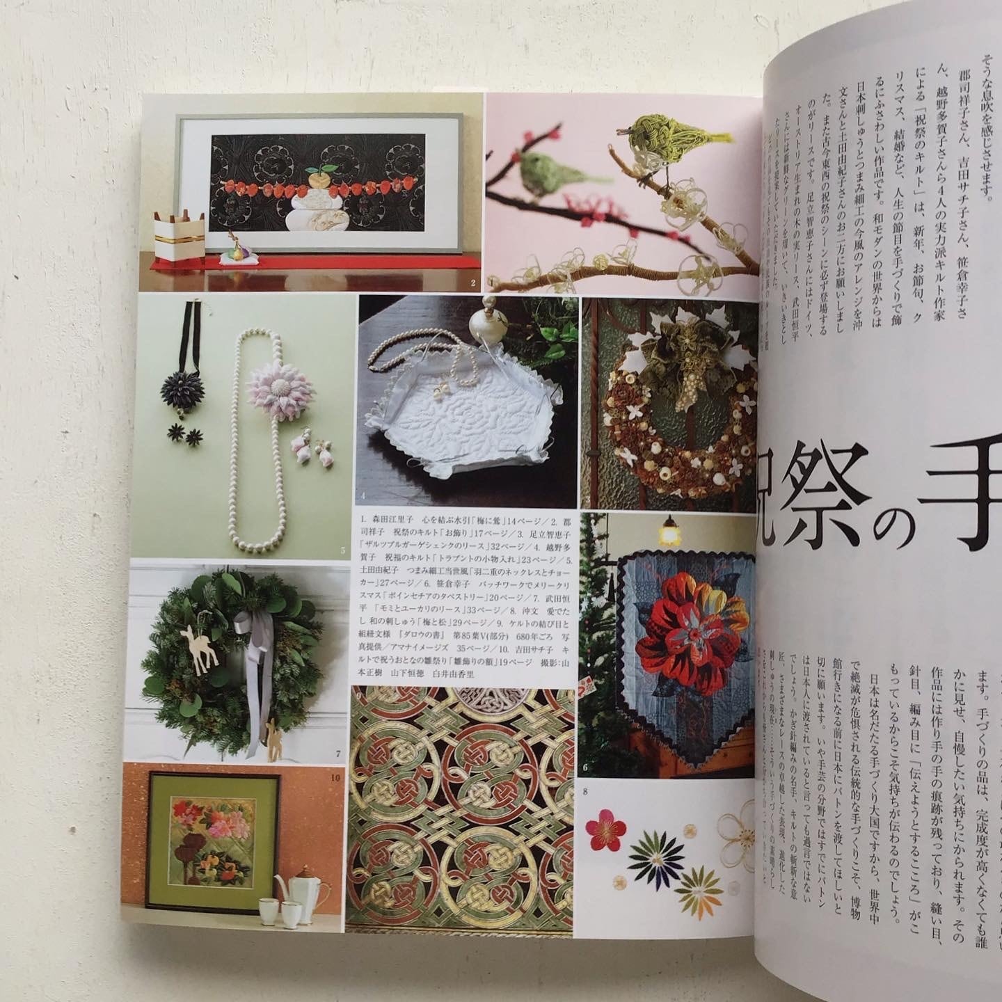 特集は祝祭の手づくり。祝祭のキルトや心を結ぶ水引、「結び」と「組紐」のケルト紋様など、どの記事も読みごたえがあります。付録に森田江里子さん監修のオリジナル・お祝い水引キット付き。越野多賀子さんのブティでつくるドイリーや小物入れ、沖文さんの和のししゅう、笹倉幸子さんのクリスマスキルトなど、誌面に掲載されている一部作品の図案が付いております。