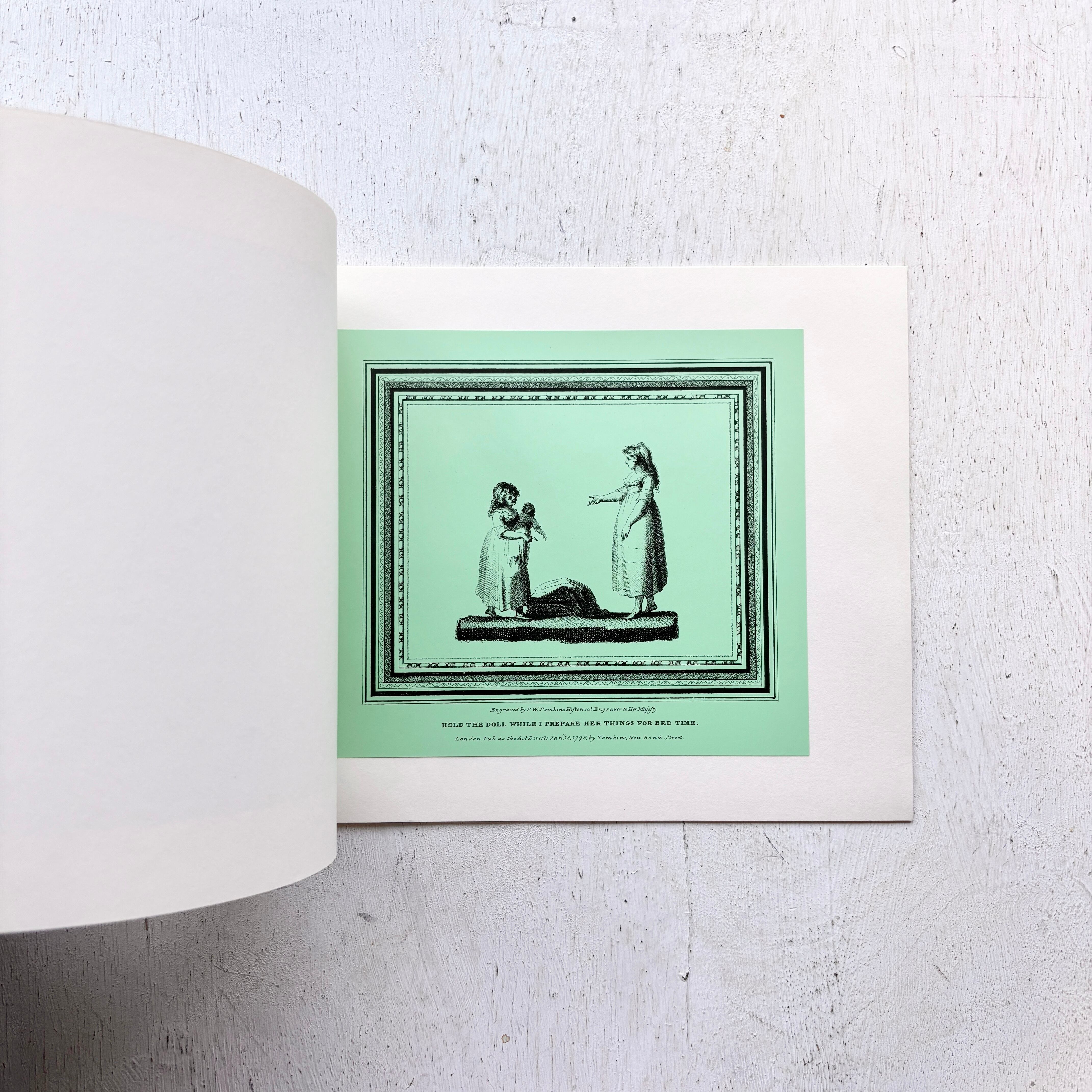 誕生日にお人形をもらった女の子が遊ぶ様子が描かれています。テキストの記載はございません。