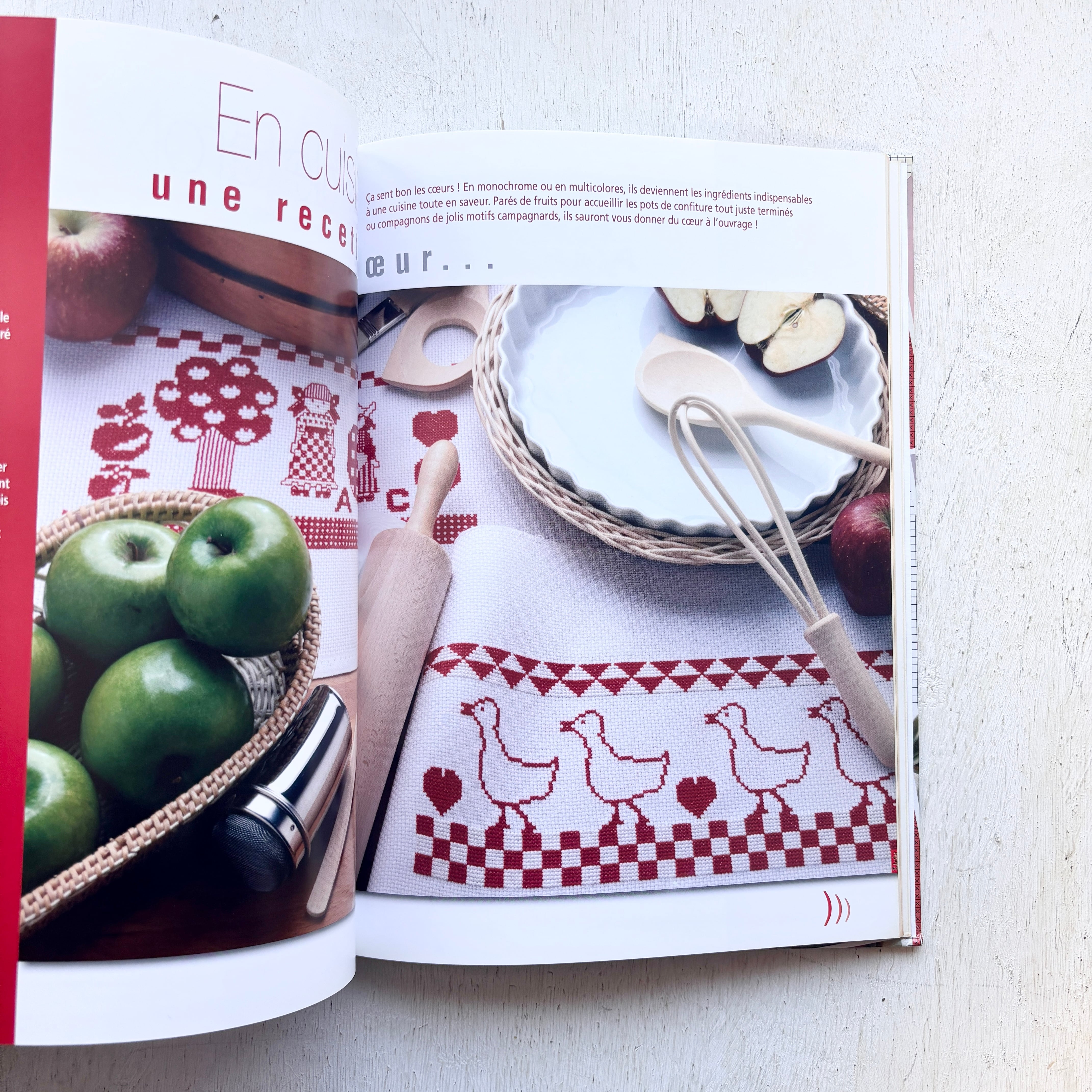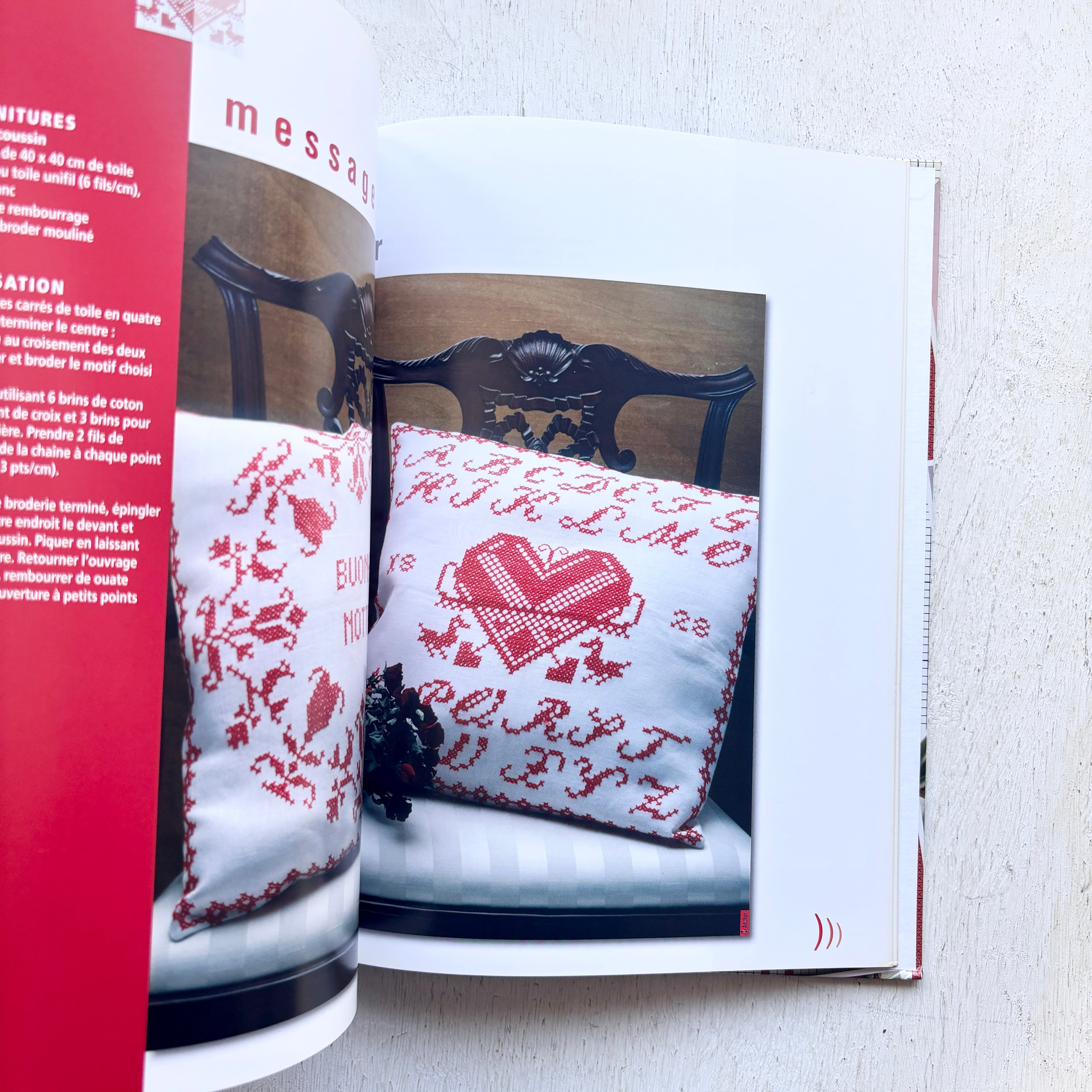 赤やピンクの糸を中心に使用した、ハートやアルファベット、妖精、クリスマスのリースなどのモチーフを収載。